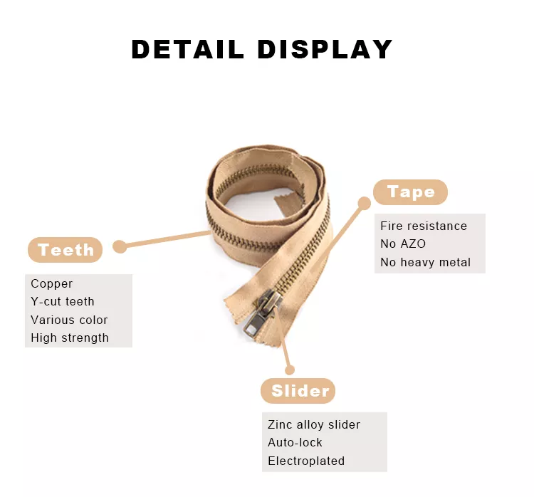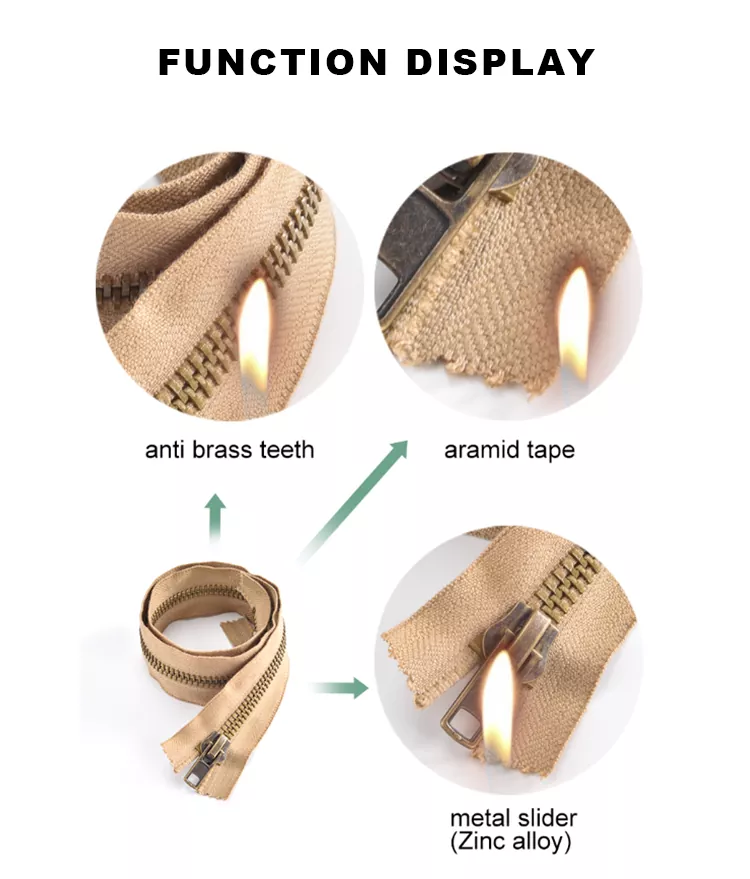 TRC 내화성 금속 지퍼는 자체 소화성이 뛰어난 고품질 난연성 웨빙으로 제작되어 웨빙이 공기 중에서 타거나 발화하는 것을 효과적으로 방지하여 의류와 장비의 안전성을 근본적으로 향상시킵니다. 뛰어난 내열성으로 알려진 이 지퍼는 최대 300°C의 온도에 단기간 노출되어도 수축, 균열, 녹는 일 없이 견딜 수 있습니다. 안정적인 성능과 지속적인 내구성으로 인해 열악한 고온 환경에서 사용할 수 있는 신뢰할 수 있는 선택입니다.