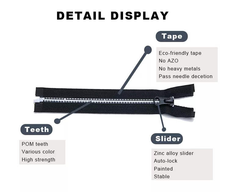TRC 재활용 플라스틱 지퍼는 고강도 성형 플라스틱 톱니로 만들어지며 변형, 마모 및 반복 사용에 대한 탁월한 저항성을 제공합니다. 가볍고 내구성이 뛰어난 폴리에스터 테이프는 지퍼의 유연성과 편안함을 향상시켜 의류, 아웃도어 장비, 수하물 및 성능과 내구성이 중요한 기타 용도에 이상적인 선택입니다.